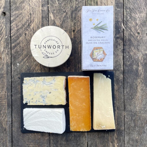Includes a box of The Fine Cheese Co. Rosemary and Olive Oil Crackers (GF option available) and Ouse Valley Cheesboard Chutney.